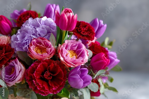 Vibrant floral bouquet with red carnations, purple tulips, and pink peonies