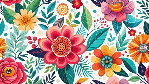Vibrant Floral Design Featuring a Colorful Array of Blossoms and Lush Greenery, Perfect for Textiles, Wallpaper, or Festive Decorations