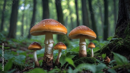 Vibrant forest mushrooms growing on lush green moss in a serene woodland environment surrounded by tall trees and soft sunlight.