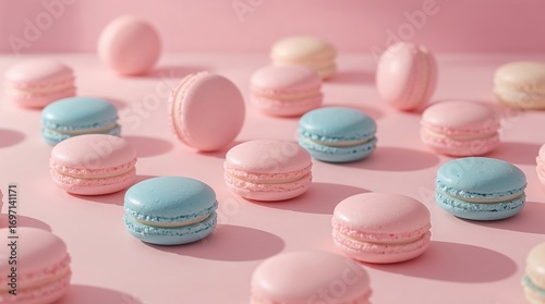 Vibrant French Dessert Macarons: Pink and Blue Sweet Treats in Creative Pastry Confectionery Display with Floral Arrangement