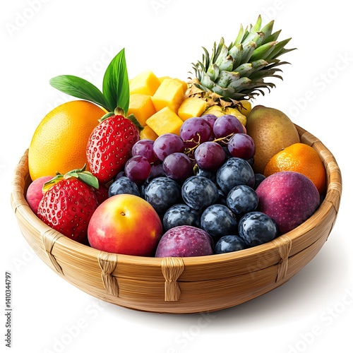 Vibrant Fruit Bowl: A colorful assortment of fresh fruits—strawberries, grapes, mango, pineapple, kiwi, and peach—are artfully arranged in a rustic wooden bowl.