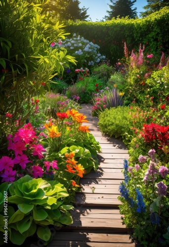 vibrant garden beds showcasing diverse plant arrangements colorful lush varied textures lively outdoor setting, plants, flowers, foliage, colors, greenery
