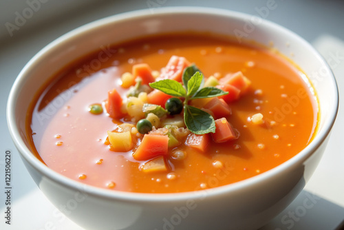 Vibrant gazpacho soup with diced vegetables in natural light