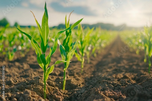 Vibrant green corn plants thrive under the warm sunlight in a sprawling agricultural landscape