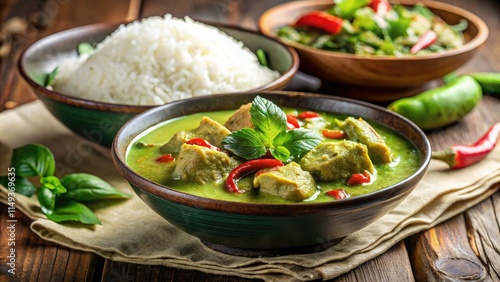 Vibrant green curry, tilt-shift photography showcases delectable Thai flavors, served with jasmine rice.