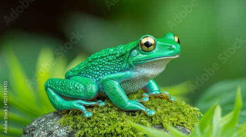 Vibrant Green Frog on Mossy Rock Tropical Rainforest Amphibian Nature