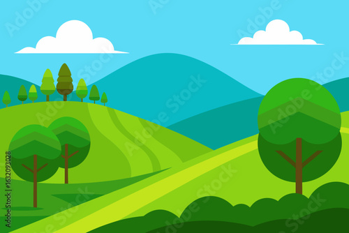 Vibrant green rolling hills and trees under a clear blue sky with clouds