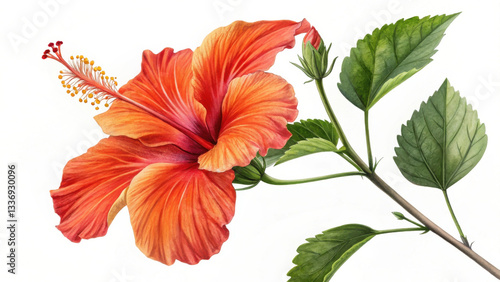 vibrant hibiscus flower with fiery red and orange petals, showcasing intricate details and lush green leaves, evokes sense of tropical beauty and warmth