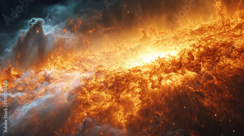 vibrant holographic solar flare bursts against the cosmic backdrop, resembling a colorful fireworks display in space, symbolizing energy, creation, and the vastness of the universe