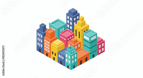 Vibrant isometric city concept with diverse colorful buildings representing urban development and community growth