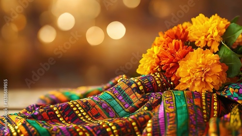 Vibrant kente cloth with golden beads and marigolds, celebrating African Liberation Day with warmth and intricate beauty.