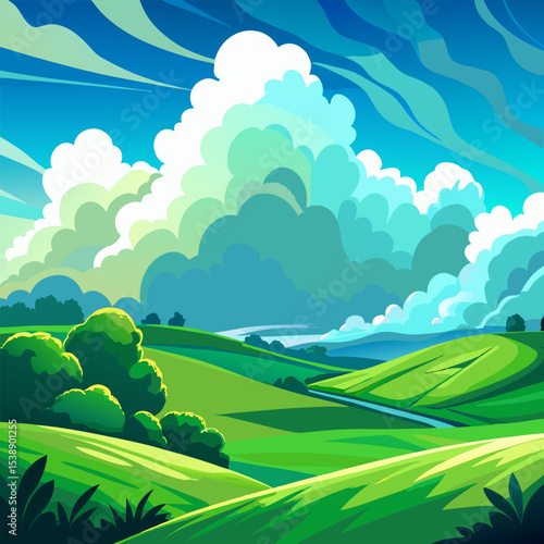 Vibrant Lush Green Hills and Rolling Landscape Vector Design Illustration