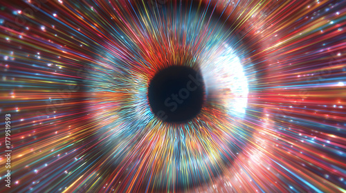 Vibrant Macro Eye Iris with Colorful Light Streaks and Digital Energy Flow Concept