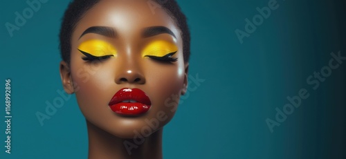 Vibrant makeup artistry featuring bold yellow eyeshadow, striking winged eyeliner, and glossy red lips on a model with short hair against a blue background, copy space for text