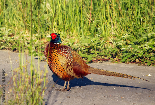 Vibrant male pheasant with colorful plumage stands on a sunny pathway surrounded by lush greenery in a natural environment, showcasing its unique patterns and textures in this serene wilderness scene.
