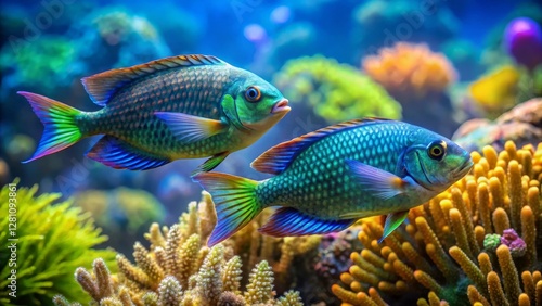 Vibrant Marine Life Two Exquisite Tropical Fish Gracefully Swimming Amidst a Lush Coral Reef Ecosystem