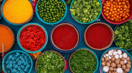 Vibrant Market Display with Colorful Bowls of Fresh Vegetables and Spices