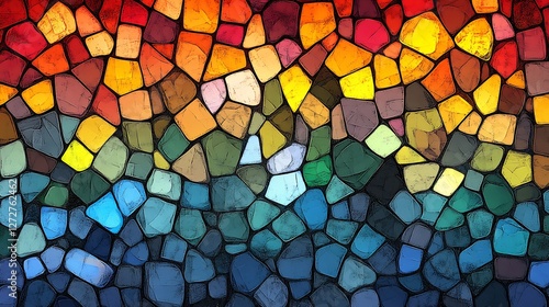Vibrant mosaic texture displays richly saturated colors transitioning smoothly from warm to cool tones. AI Generated