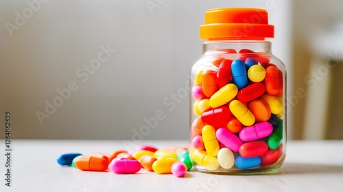 Vibrant Multicolored Capsules in a Transparent Prescription Bottle
