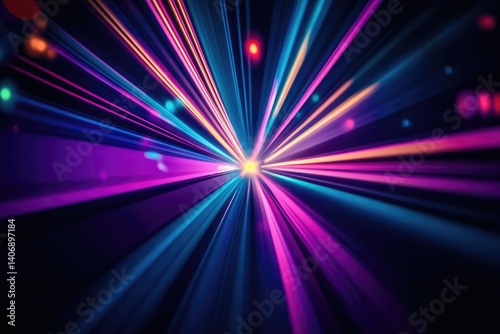 Vibrant neon light rays converge at a central point, creating a dynamic and energetic abstract composition.
