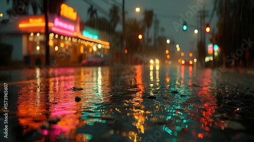 Vibrant neon lights reflecting on wet city street during a rainy night