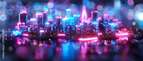 Vibrant Nighttime Cityscape with Neon Lights and Reflections in Water