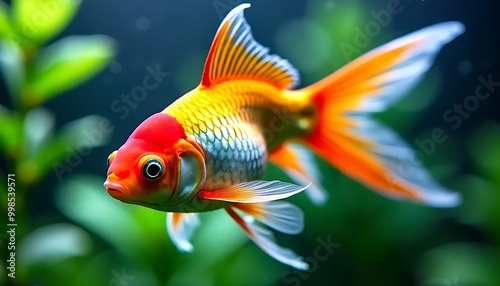 Vibrant Orange and White Ranchu Fish with Elaborate Fins and Tail Swimming Gracefully in a Serene Aquarium