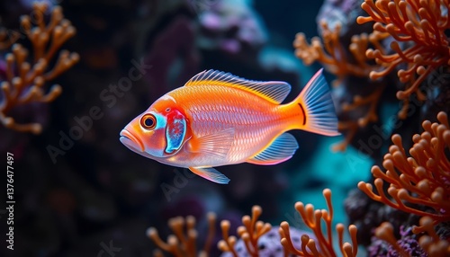 Vibrant orange fish swimming amidst colorful coral reef, showcasing its intricate scales and fins in an underwater paradise