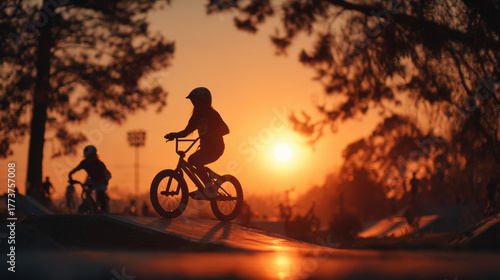 Vibrant outdoor scene of cyclist riding bicycle during sunset with scenic horizon, nature silhouette, adventure, leisure activity, outdoor recreation, and scenic landscape