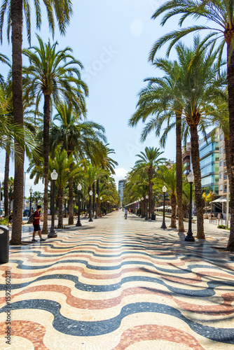 Vibrant palm tree-lined pathway in Alicante, Spain, showcasing beautiful patterned tiles under a blue sky, inviting leisurely strolls and relaxation in a sunny outdoor setting.