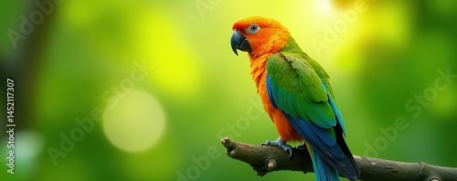 Vibrant parrot on lush green branch, sunlight gleaming on feathers , colorful, tropical bird