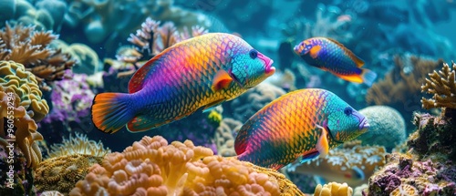 Vibrant Parrotfish Feeding on Colorful Coral Reef in Tropical Waters