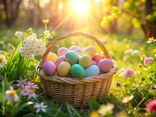Vibrant pastel-colored Easter eggs and spring flowers adorn a woven basket, surrounded by lush greenery and soft, warm