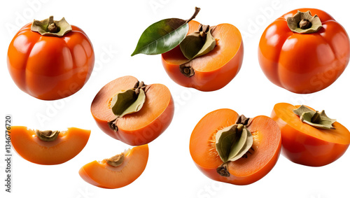 Vibrant Persimmons with Leaves in Various Cut Configurations