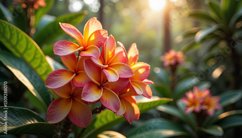 Vibrant plumeria flowers blooming in sunlight