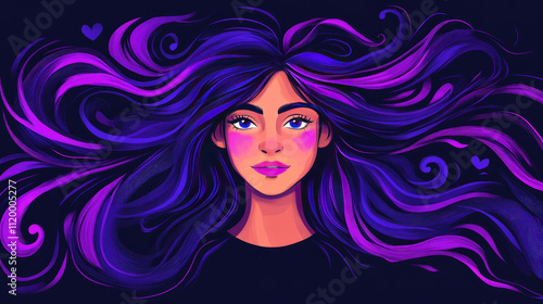 Vibrant Portrait of Woman with Flowing Purple Hair and Hearts on Dark Background