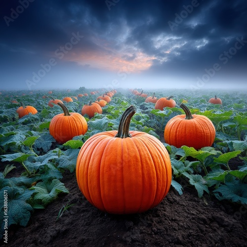 Vibrant Pumpkin Field Under Dramatic Sky at Dawn