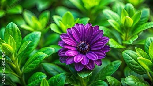 Vibrant purple flower surrounded by lush green leaves in a nature setting