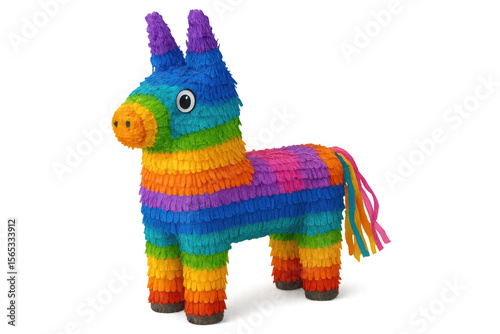Vibrant rainbow donkey piñata hanging, symbolizing party excitement and cultural festivity