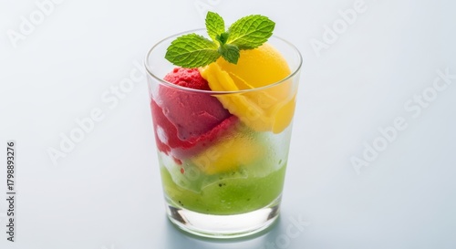 Vibrant Rainbow Fruit Cocktail with Fresh Ingredients - Beautiful Multi-Color Layered Beverage Featuring Pink, Green, and Yellow Fruit Layers with Fresh Mint Garnish, Perfect for Parties and Refreshin
