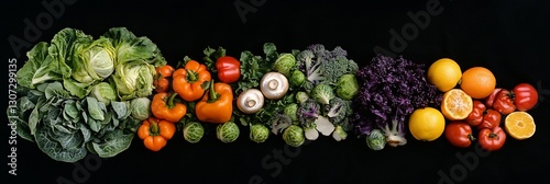 Vibrant rainbow of fresh vegetables and fruits arranged on black background.