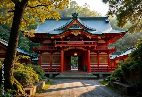 Vibrant Red Pagoda Standing Majestically Amidst a Lush Forest