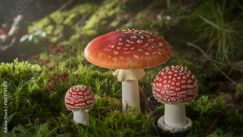 Vibrant Red Toadstools Growing in Green Moss, Red Fly Agaric Mushrooms