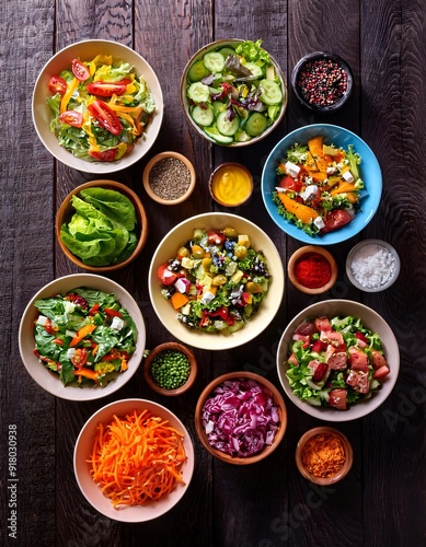 Vibrant salads in bowls and cooking ingredients on a rustic wooden table