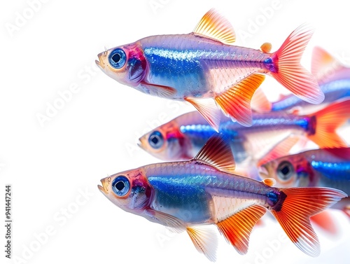 Vibrant School of Colorful Cardinal Tetras Swimming in Unison on White Background