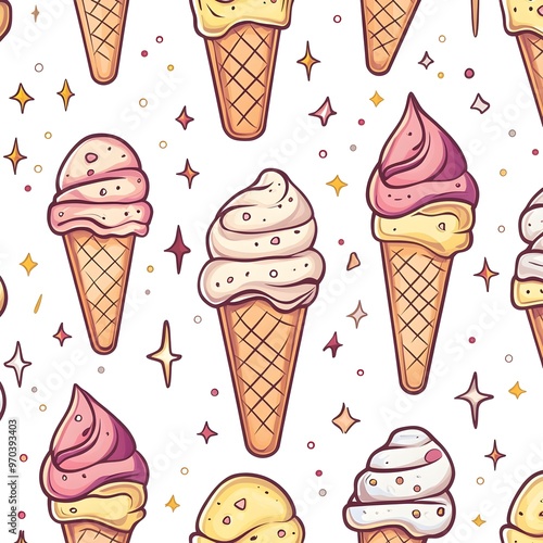 Vibrant Seamless Pattern with Assorted Ice Cream Cones and Scoops on White Background