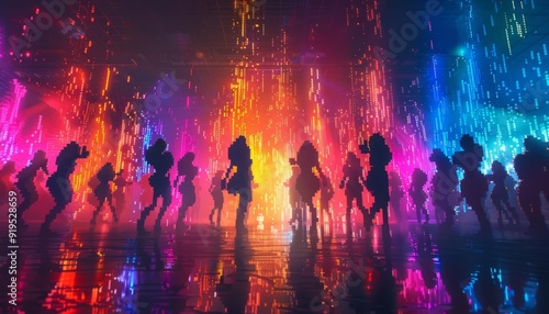 Vibrant silhouettes dancing in a colorful light show with neon colors and dynamic energy, creating a lively nightlife scene.