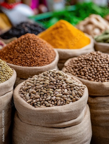 Vibrant Spice Stall at Indian Market Showcasing an Array of Colorful Spices in Tote Bags, Perfect for Culinary Enthusiasts and Cultural Exploration