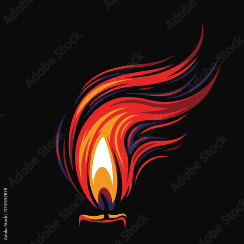 Vibrant, stylized flame illustration with dynamic red, orange, and yellow swirls on a dark background.