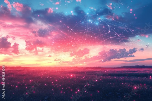 Vibrant sunset blends with cosmic elements, creating serene, dre